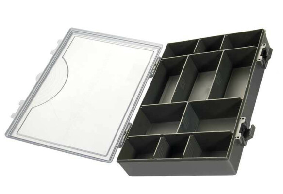 Prostorná kaprařská krabička na příslušenství z odolného plastu s posuvnými přihrádkami, která pojme i několik krabiček Mini.