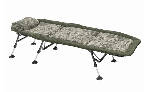 Extrémně lehké, velké a 100% ploché lehátko ve velice atraktivním designu s digitálním maskováním. Nadstandardně silná a velmi komfortní matrace s fleecovou vrchní vrstvou nabízí nejúčinnější systém regulace tuhosti pomocí elastického šněrování na spodní straně. Další výhodou jsou nohy s rozměrnými výkyvnými patkami a možností velkého vysunutí. Lehátko je dostupné ve variantě s osmi nebo se šesti nohami.