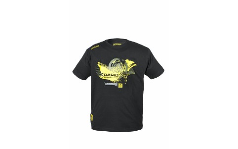 Kvalitní bavlněné tričko v černé barvě s atraktivními aplikacemi na zádech, na hrudi a na rukávu.